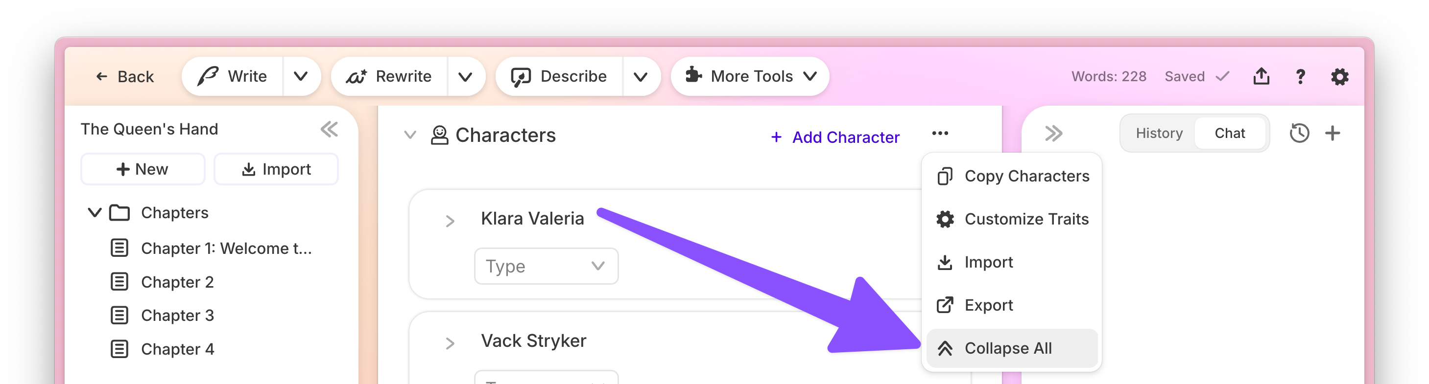 We’ve also added the ability to quickly collapse or expand all of your Character or Worldbuilding cards at once. Just click the More menu (•••) and select Collapse All to instantly tidy things up for easier navigation. You can open cards individually, or use the same menu to Expand All whenever you like.