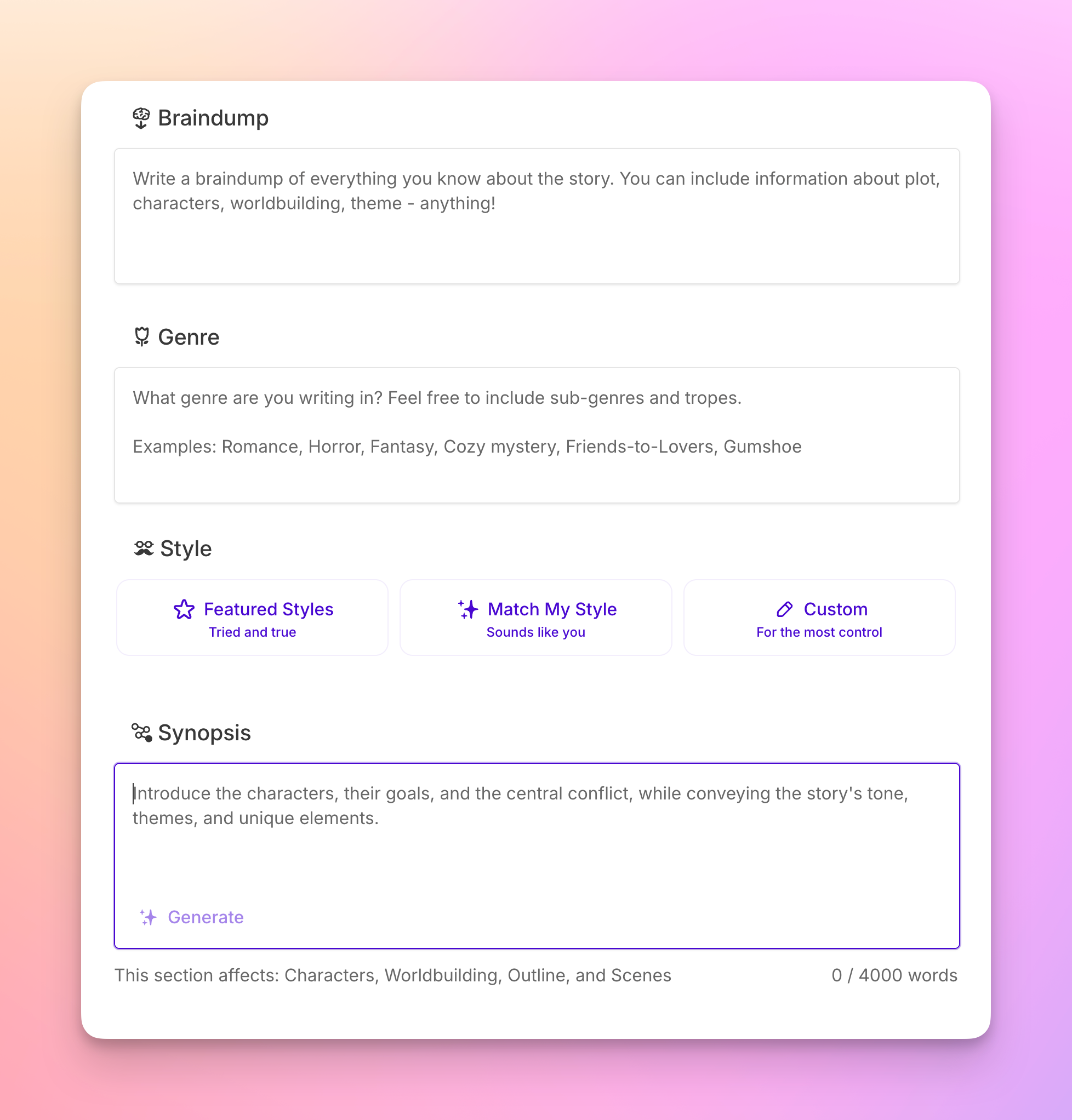 For example, put your cursor inside of a field to see the helper text that was previously always visible (that is, which Story Bible sections it influences and its word limits). We also moved the Synopsis field’s Generate button inside of the Synopsis field to match how buttons work in Character and Worldbuilding cards—like those, it will now only appear once your cursor is in that field.
